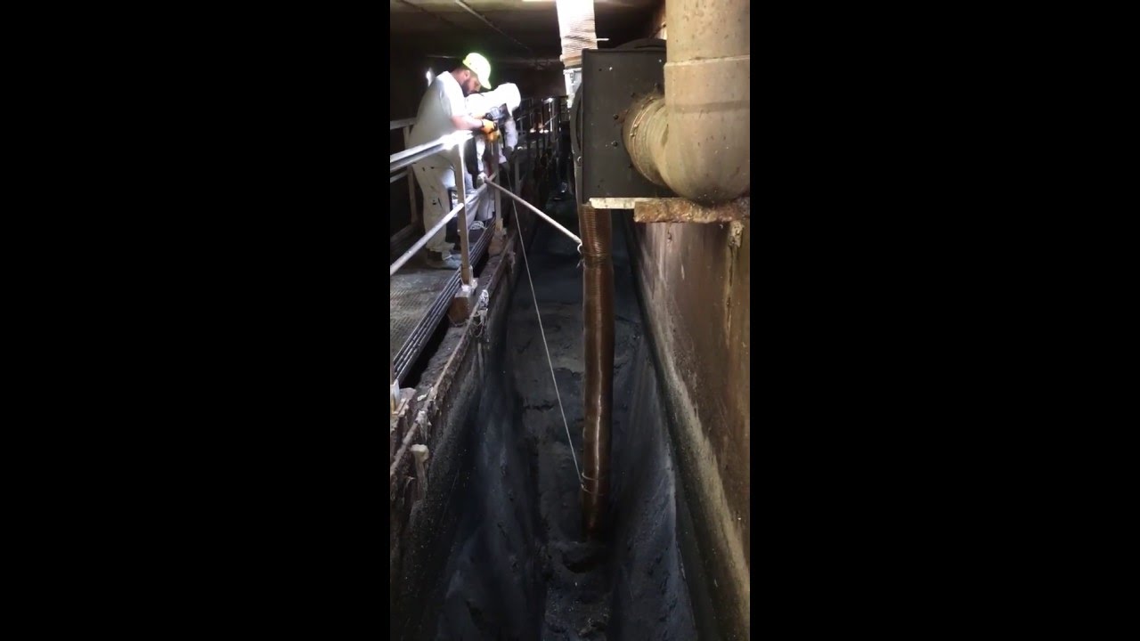 Grâce à sa puissance et à la grande longueur de son tuyau, l’excavatrice-aspiratrice peut aspirer dans des espaces particulièrement confinés, comme ici dans la station de dessablage de Sanguinaire.